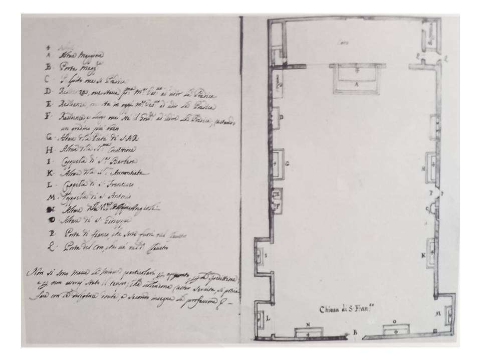 (settima parte) Amelio Fara scrive che “il convento di San Francesco era usato come caserma dall’anno 12 del calendario repubblicano (1803-04);nel 1806 ne era stato eseguito un rilievo esemplare comprendente il piano dei sotterranei ,con la cisterna e la cripta,il piano terreno e il primo piano del convento e della chiesa ,le sezioni e il prospetto “