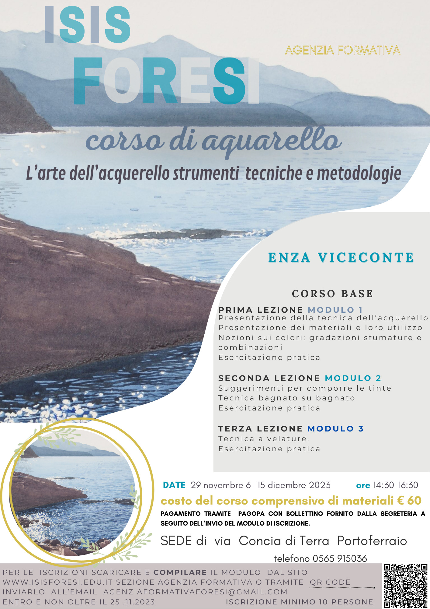 Tra le attività dell’agenzia formativa, quest’anno, la prof.ssa Enza Viceconte, riconosciuta artista elbana, terrà un corso sull’arte dell’acquerello, sugli strumenti, le tecniche e le metodologie di una modalità di rappresentazione pittorica che affonda le sue radici nel Rinascimento. Il corso, articolato in tre lezioni, della durata di due ore ciascuna, si terrà presso la sede di Concia di Terra il 29 novembre, il 6 e il 15 dicembre 2023 dalle 14,30 alle 16,30. Per iscriversi è possibile scaricare il modulo dal sito dell’agenzia formativa (www.isisforesi.edu.it), compilarlo e inviarlo a agenziaformativa@isisforesi.com . A seguito dell’iscrizione sarà possibile pagare la quota di iscrizione di 60 euro, comprensiva del costo dei materiali per la pittura, tramite PAGOPA con bollettino fornito dalla segreteria.