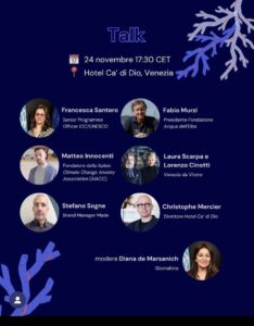 L’evento si aprirà venerdì 24 novembre (ore 17.30) con la Tavola Rotonda ospitata presso l’Hotel Ca’ di Dio, parte della collezione VRetreats, brand di hôtellerie di VOIhotels, divisione alberghiera di Alpitour World, rivolto al segmento luxury del mercato italiano e internazionale. Moderato dalla giornalista Diana de Marsanich, il dialogo coinvolgerà Francesca Santoro (Senior Programme Officer IOC/UNESCO), Christophe Mercier (direttore Ca’ di Dio), Matteo Innocenti (Psicoterapeuta specializzato in eco-ansia, Fondatore e Presidente della Italian Climate Change Anxiety Association – AIACC), il navigatore, skipper di Maserati Multi70 Giovanni Soldini, Laura Scarpa e Lorenzo Cinotti (Venezia da Vivere).