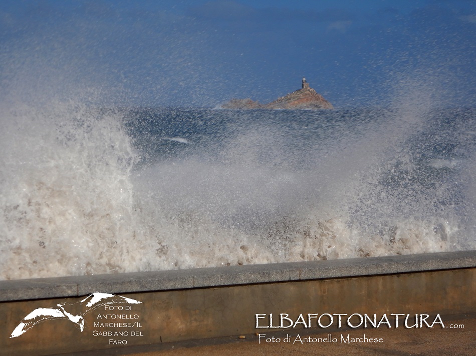 Ecco alcune immagini scattate verso lo Scoglietto di Portoferraio insieme al suo piccolo faro investito dai colpi di mare, con la schiuma che lambisce la struttura di segnalazione, e alle Ghiaie dove grandi frangenti si riversano sulla battigia per esplodere sul muretto che delimita la spiaggia.