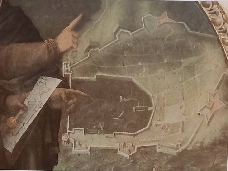 Il particolare dell’affresco della fondazione di Portoferraio di Giorgio Vasari presente a Palazzo Vecchio in Firenze , databile circa 1557, evidenzia bene la situazione dei quartieri descritti dal Lambardi contigui alla Porta di Mare a sinistra,verso levante in oggi detta delle Galeazze