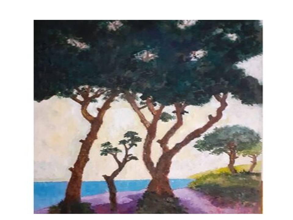 L’opera del pittore Luigi Congedo, “Conflitto” qui riprodotta, oltre alla rappresentazione d’ immagine delineata con il tratteggio di alberi dipinti con uno stile neo impressionista nei pressi della costa, lascia intravedere anche l’ importante significato emblematico sottostante. Si tratta di un quadro che vedremo a fine della prossima primavera, esposto anche nella Galleria d’ Arte a Roma. Questa opera paesaggistica raffigurata da alberi vicini ad un litorale, ritrae una amena tipica località costiera evidenziata da mare, terra e vegetazione sotto un cielo che non lesina luce e benessere. Il quadro è di per sé esaustivo nella sua espressione figurativa del tratteggio, della scelta dei colori, dei contrasti e del contesto paesaggistico ritratto. Ma ad una più attenta osservazione il simbolismo delle figure volutamente pitturate in differenti condizioni di luce e di luogo, raccontano la loro storia. Il mare è dipinto di un celeste omogeneo tranquillo, mentre il sole che rimane nascosto inonda il contesto di luci e ombre. Al centro vi sono due grandi alberi dai rami e dai tronchi contorti che manifestano con il loro intreccio la tipica disputa per l’accaparramento della luce solare. La lotta è finalizzata alla reciproca chiusura di ogni spazio vitale che però si riflette a discapito di un altro alberello del medesimo contesto arboreo che pertanto non riesce a crescere se non in modo asfittico. Le conseguenze come si vede, sono rappresentate dalle ridotte dimensioni della pianta, tratteggiata con piccole espansioni del verde fogliame, come massima offerta che i nudi rami possono dare in simili condizioni.