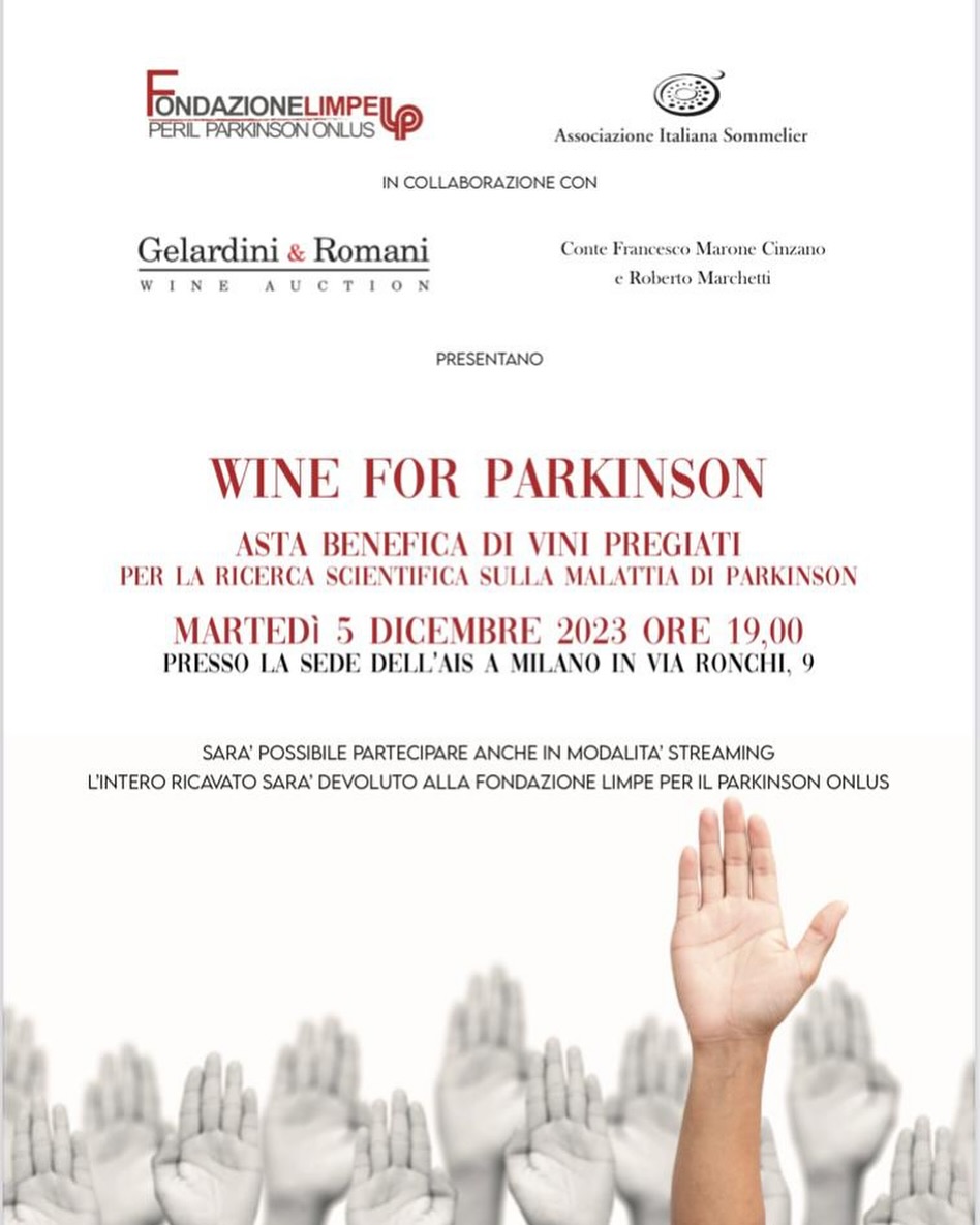 Martedì 5 dicembre 2023, presso la sede dell’Associazione Italiana Sommelier di Milano (via Ronchi 9), si è tenuta la seconda edizione di Wine for Parkinson, un’asta benefica di vini pregiati per la ricerca scientifica sulla malattia di Parkinson, promossa da Fondazione Limpe per il Parkinson Onlus, in collaborazione con Associazione Italiana Sommelier, Casa d’Aste Gelardini & Romani Wine Auction, Conte Francesco Marone Cinzano e Roberto Marchetti, noto wine seller dell’Isola d’Elba.