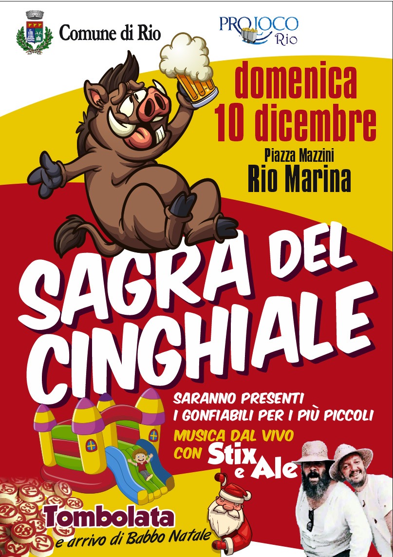 Domenica 10 dicembre a Rio Marina arriva la “Sagra del cinghiale”, organizzata dal comune di Rio e dalla Pro loco. L’appuntamento è in Piazza Mazzini a partire dalle ore 12.30. La giornata sarà accompagnata dalla musica dal vivo di zio Stix e Ale. I più piccoli potranno divertirsi con i gonfiabili. Ci sarà la tombolata e nel pomeriggio l’accensione dell’albero, con l’ arrivo di Babbo Natale.