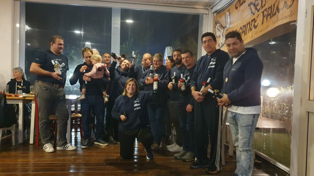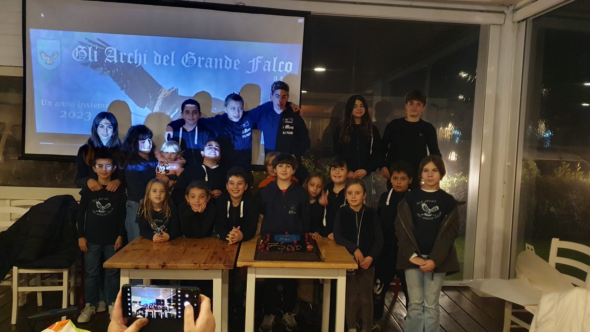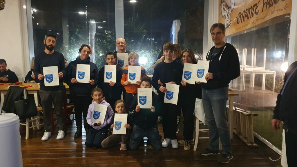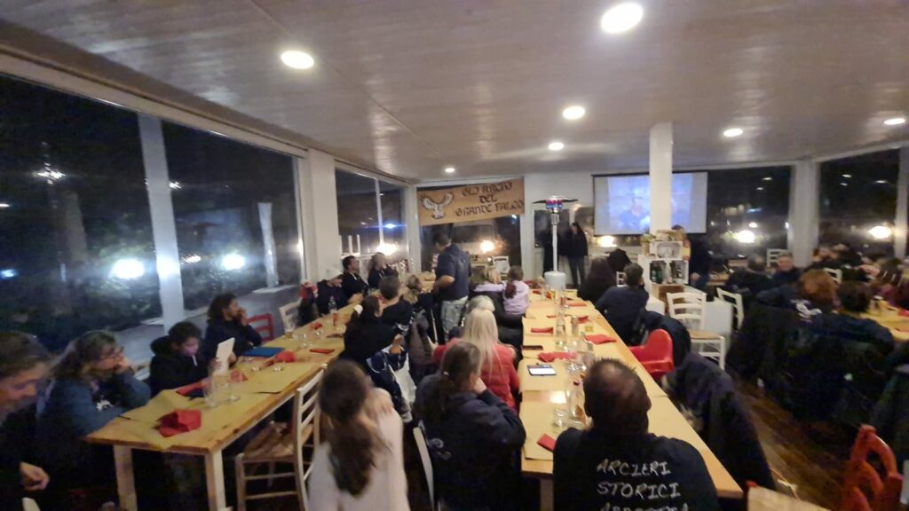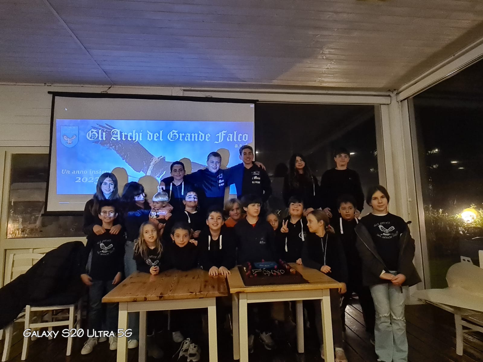 Poi si smonta per poi ritrovarsi il giovedì dopo ,cioè il 7 dicembre ,per godersi la consueta festa di un anno insieme che è arrivato al 7° ed in cui c’e stata una folta partecipazione di ben 65 persone ,tra atleti e familiari ,che con filmati e foto fa rivivere tutti i momenti salienti dell’anno in corso, con applausi di gratificazione di tutti gli atleti che hanno lavorato molto per ottenere i risultati conseguiti nell’anno passato, sia con i Pali elbani delle Terre che ci fanno conoscere in giro,sia con le gare arco storico della Lega Arcieri Medievali e con le gare di Campionati Italiani e Regionali Fitarco di arco Olimpico soprattutto e Compound.Come tutti i gruppi che stanno in piedi ,i nostri ragazzi hanno bisogno di colonne portanti e si ringrazia i genitori e gli accompagnatori che si adoperano in caso di bisogno , giorno e notte e con acqua o sole per fare si che tutto proceda per il meglio .A seguire diplomi per i nuovi arrivati , premi per tutti seguiti da lunghi applausi . Onore e lunga vita al Grande falco!