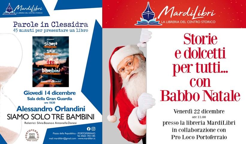 -Venerdì 22 alle ore 11,00 la tanto attesa visita a Mardilibri di Babbo Natale che racconterà una storia ai bambini e alle bambine della scuola materna Tonietti e della primaria del centro e a tutti gli altri che vorranno venire! Storia , dolcetto , un girotondo intorno all’albero di Piazza Cavour e visita alla casa di Babbo Natale allestita dalla Proloco di Portoferraio ,insomma una mattina di duro lavoro per il nostro Babbo Natale ,di cui non possiamo svelare l ‘identità ma che ringraziamo con tanto affetto.