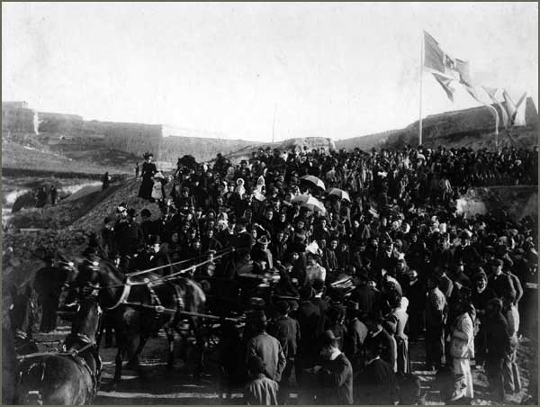 Il 13 dicembre del 1900, alle ore 10.00, parte dal centro storico di Portoferraio il corteo per assistere alla posa della prima pietra degli “Alti Forni”. La madrina dello stabilimento fu Lucia Del Buono, figlia di Pilade. Centinaia di cittadini si accalcano sulle alture della collinetta dove sorge il Forte Saint Cloud, costruito dai Francesi agli inizi dell’ottocento e sventrato per far posto alle altissime ciminiere. Fra le conseguenze che ne derivarono, si registrò un sensibile incremento