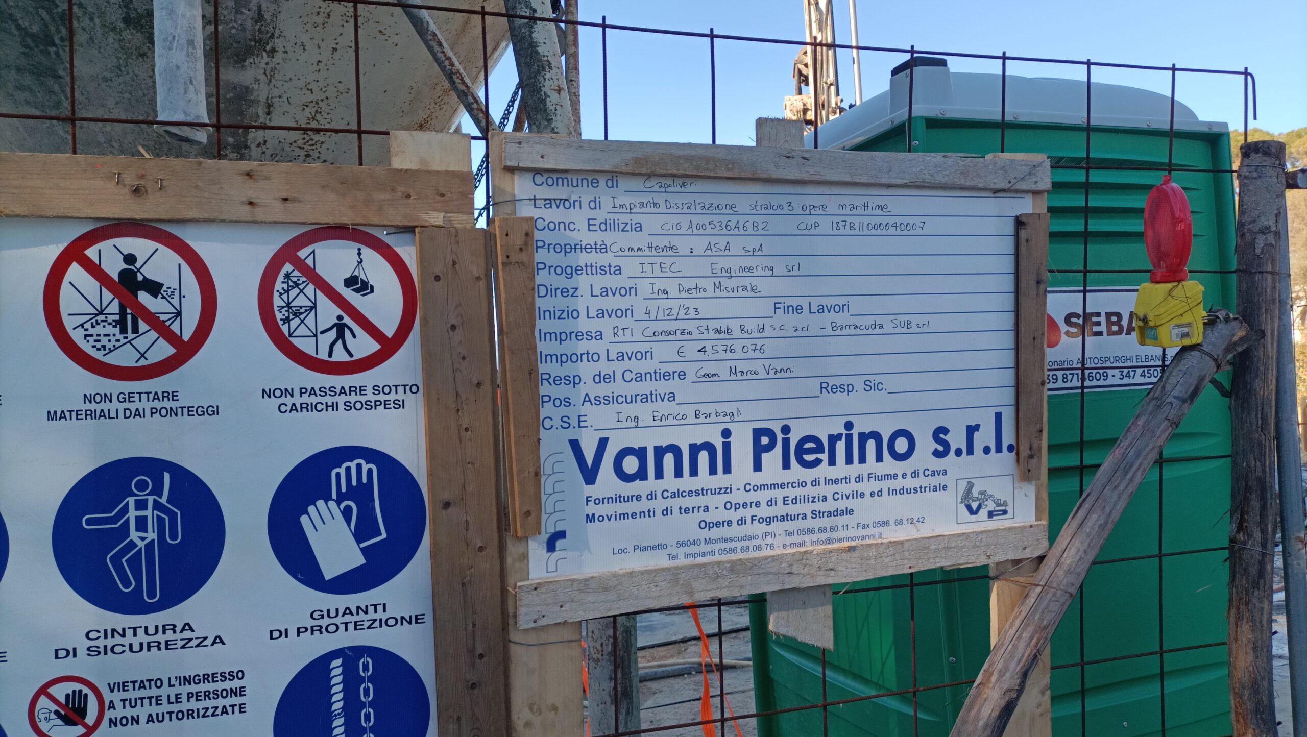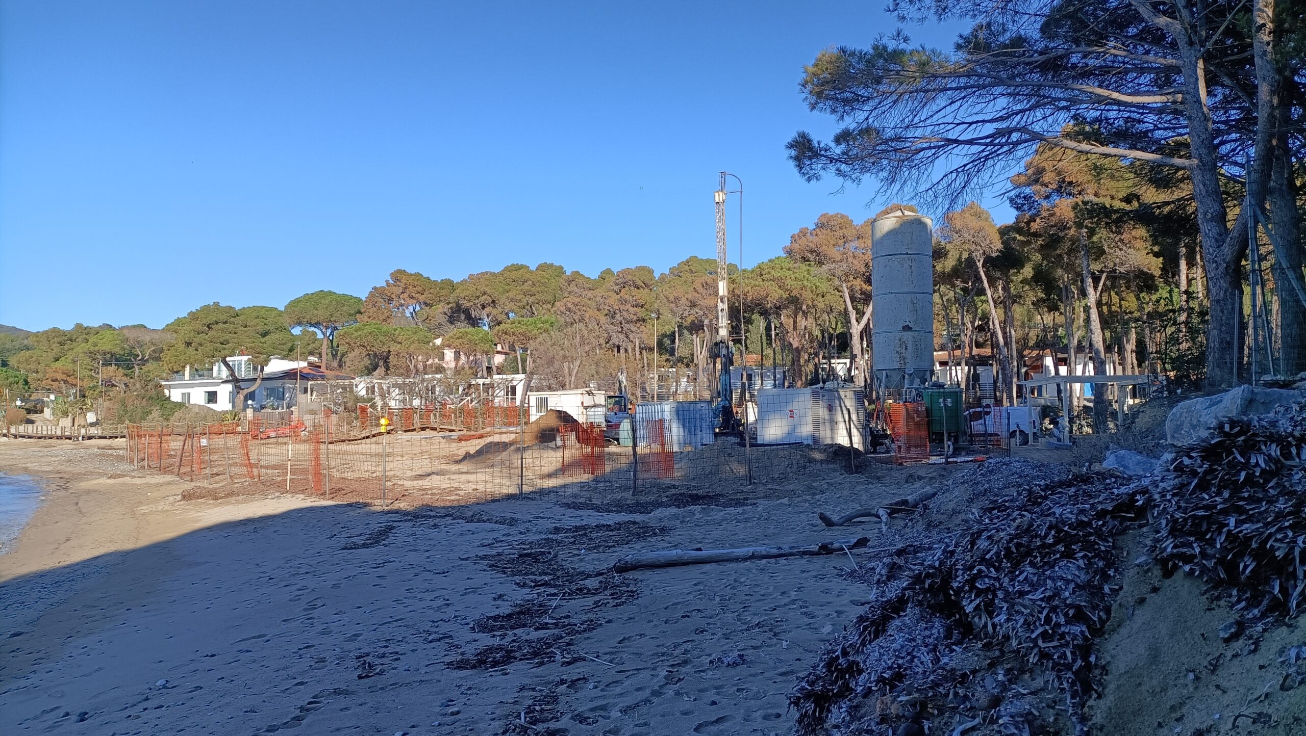 Proseguono anche a ridosso delle festività natalizie i lavori per la realizzazione del dissalatore di Mola e delle opere accessorie. Nonostante la giornata prefestiva, si lavora sia alla realizzazione del capannone che ospiterà i macchinari per la dissalazione, sia sulla spiaggia di Lido di Capoliveri per costruire le strutture che ospiteranno i terminali di pompaggio acqua in entrata nel dissalatore e quelli per la salamoia di scarto in uscita. In particolare in spiaggia, all’angolo fra il Camping Europa e il ristorante Il Doge, il cantiere aperto lo scorso 4 dicembre procede speditamente. A Mola, invece, si lavora per completare la chiusura del capannone della struttura principale.
