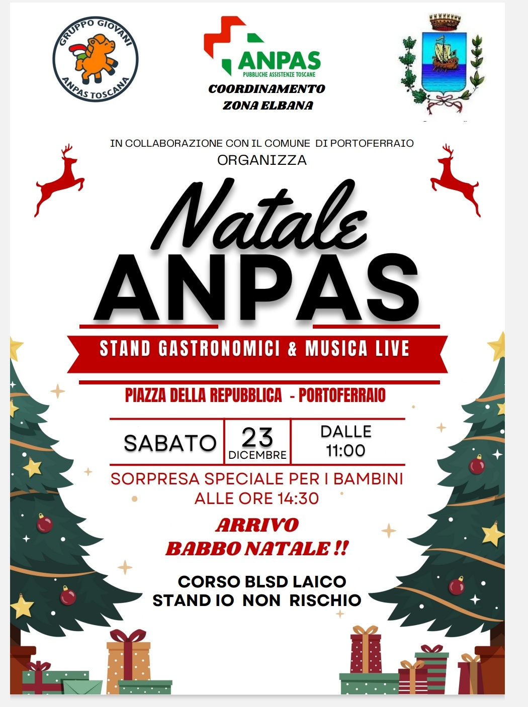 Sabato 23 Dicembre dalle ore 11,00 in Piazza della Repubblica a Portoferraio, il gruppo giovani Anpas zona elbana in collaborazione con il Comune di Portoferraio organizza come da tradizione la Festa di Natale del volontariato Anpas zona elbana. Durante la manifestazione, nello stand “Io Non rischio”, si parlerà della campagna di buone pratiche della protezione civile sui rischi alluvione, terremoto e maremoto. E’anche previsto un corso gratuito di Blsd laico (defibrillatore) con la spiegazione delle manovre di primo soccorso e l’uso del defibrillatore. Ai partecipanti verrà rilasciato un attestato di partecipazione. Alla festa oltre agli stand di dolciumi arriverà anche Babbo Natale per la gioia di grandi e piccini. . L’evento sarà accompagnato da musica live e numerose sorprese. Il ricavato andrà alle Pubbliche Assistenze colpite dall’alluvione