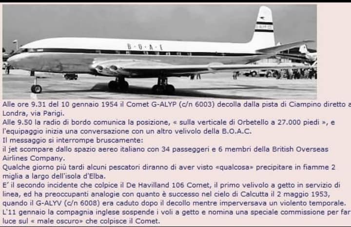 Buongiorno e complimenti per questo articolo: fu una tragedia per molti purtroppo, ma anche l’inizio dell’era moderna del viaggio aereo civile (risolti i problemi legati alla fatica dei metalli).
