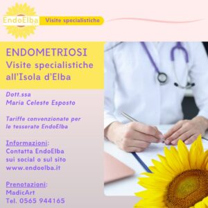 L’associazione EndoElba ha organizzato un importante progetto. Per tutto il 2024 sarà infatti possibile effettuare delle visite specialistiche anche all’isola d’Elba, presso il centro Medicart di Portoferraio, grazie alla collaborazione della Dott.ssa Maria Celeste Esposto, medico specializzato in endometriosi.