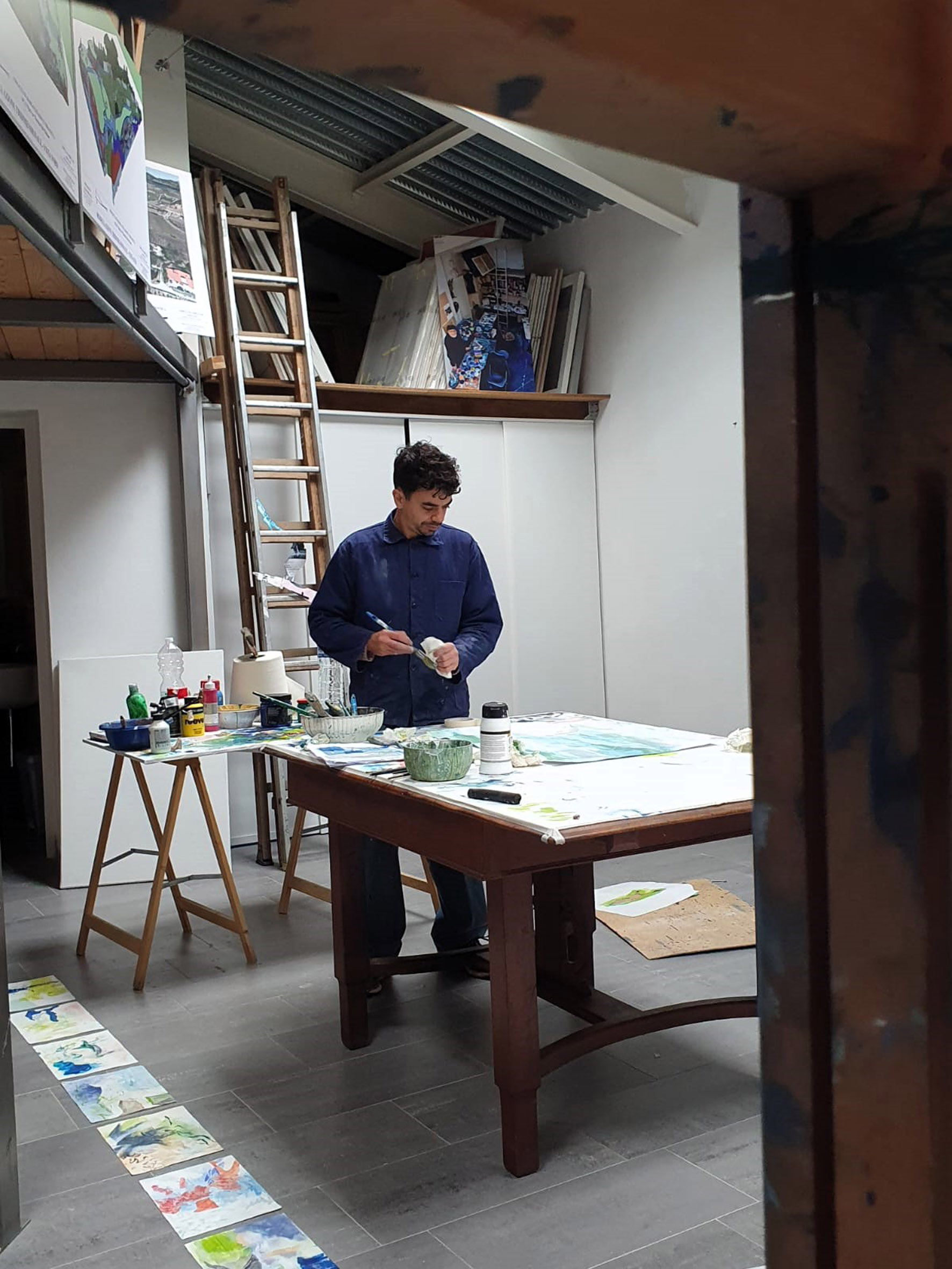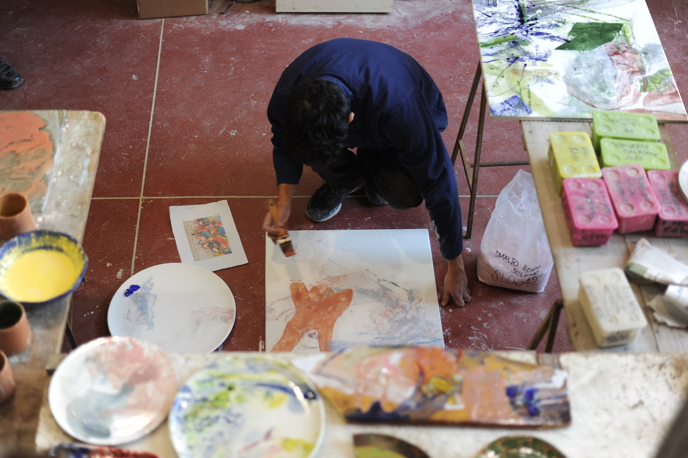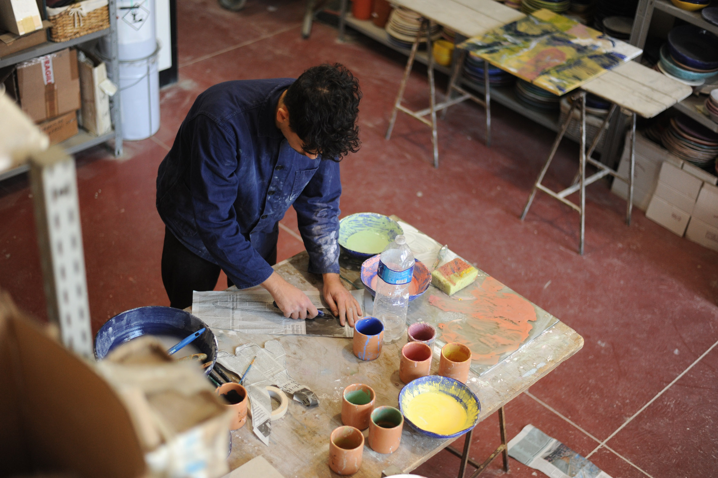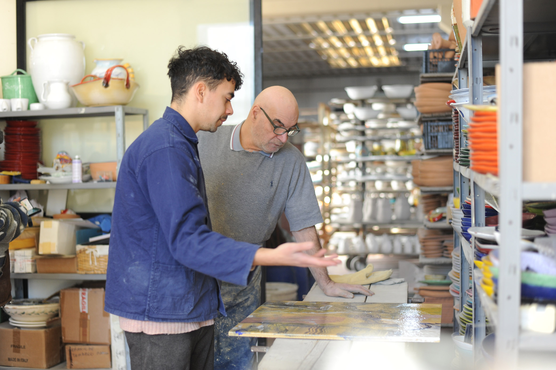 Il progetto, che si sviluppa in due momenti, porta al termine questa prima fase pratese con una residenza di residenza di Gabriele Diversi, artista visivo di origini elbane che vive e lavora a Berlino, presso l’Open Studio Italo Bolano – una volta studio dell’artista – e la fabbrica Ceramiche Tombelli, dove sono nate tutte le ceramiche bolaniane degli ultimi 20 anni. Grazie all’esperienza di Marco Tombelli, proprietario della ditta ma anche amico storico e prezioso collaboratore del maestro Bolano, il giovane Diversi ha potuto attingere ad un vasto patrimonio di conoscenze dirette sull’arte ceramica, frutto di una lunga e sapiente pratica, consolidata nel tempo, a contatto quotidiano con la materia e le sue reazioni. Sotto la supervisione di Tombelli, dunque, l’artista ha sperimentato un materiale per lui mai provato prima, come la terra refrattaria, ripercorrendo alcune fasi del processo con nuove tecniche di pittura su ceramica. In mostra, infatti, troveremo quattro pannelli di terracotta refrattaria che uniscono alla durezza della ceramica sia il fascino tutto fluido e cangiante del mare con le sue spiagge affollate sia quello di umidi e rigogliosi giardini. La ceramica, materiale antico aperto all’innovazione e all’imprevedibilità, offre così a Diversi l’occasione di esprimersi in un linguaggio inedito per