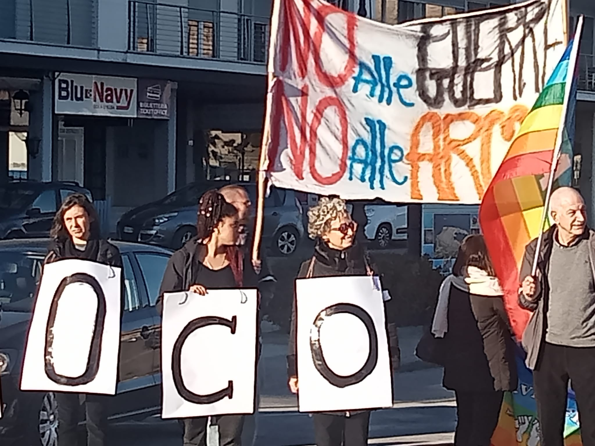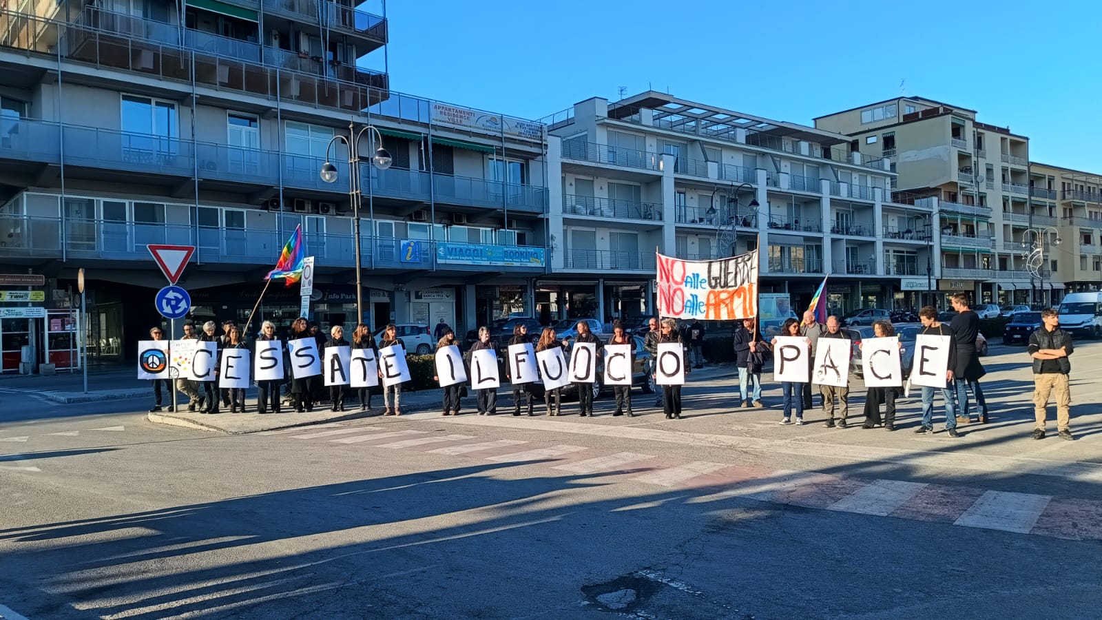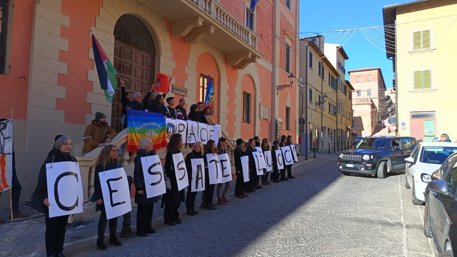 Il gruppo, sostenuto anche da uomini, si è mosso dalle ore 15:00 davanti al comune passando poi per la calata e infine arrivando al porto, allo sbarco delle navi e ripetendo il flash mob con la scritta ‘cessate il fuoco’.