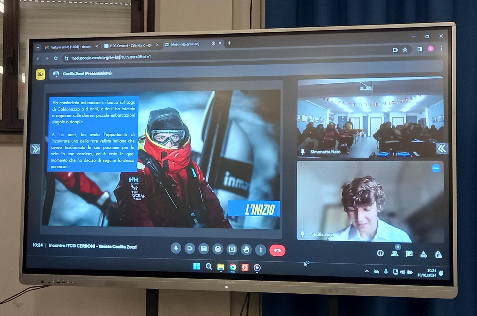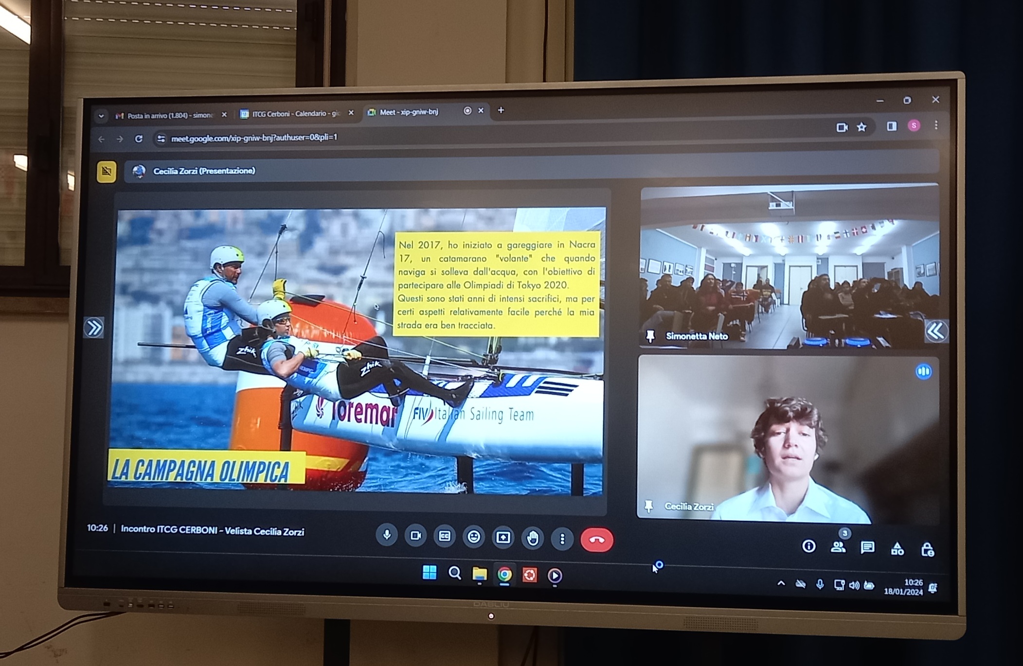 In aula magna all’ITCG Cerboni gli studenti e le studentesse delle classi prima Nautico e prima Grafico hanno avuto il privilegio – nell’ambito del progetto Vela a Scuola, coordinato dalla Lega Navale Italiana di Portoferraio – di incontrare online la giovane velista “fuoriclasse” Cecilia Zorzi, introdotta e intervistata dal Direttore Sportivo FIV di Zona Filippo Arcucci, già campione nelle classi optimist, ILCA (Laser) e attualmente membro di equipaggi persino nelle regate della Marina Militare.