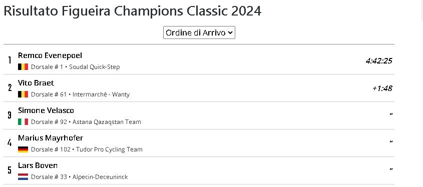 In Portogallo, l’elbano che sotto la maglia tricolore porta i colori dell’Astana Qazaqstan , ha conseguito un terzo posto alla Figueira Champions Classic 2024, che si è corsa in Portogallo. Protagonista di giornata il campione del mondo a cronometro Remco Evenepoel: il belga della Soudal – QuickStep è stato protagonista di un’azione solitaria a 50 chilometri dalla conclusione, che lo ha portato in solitaria sul traguardo con 2 minuti di vantaggio sul gruppo. Malgrado alcuni tentativi èstato tuttavia allo sprint che si sono decisi il podio e i piazzamenti di giornata, con Velasco battuto sul traguardo solo dal belga Braet.