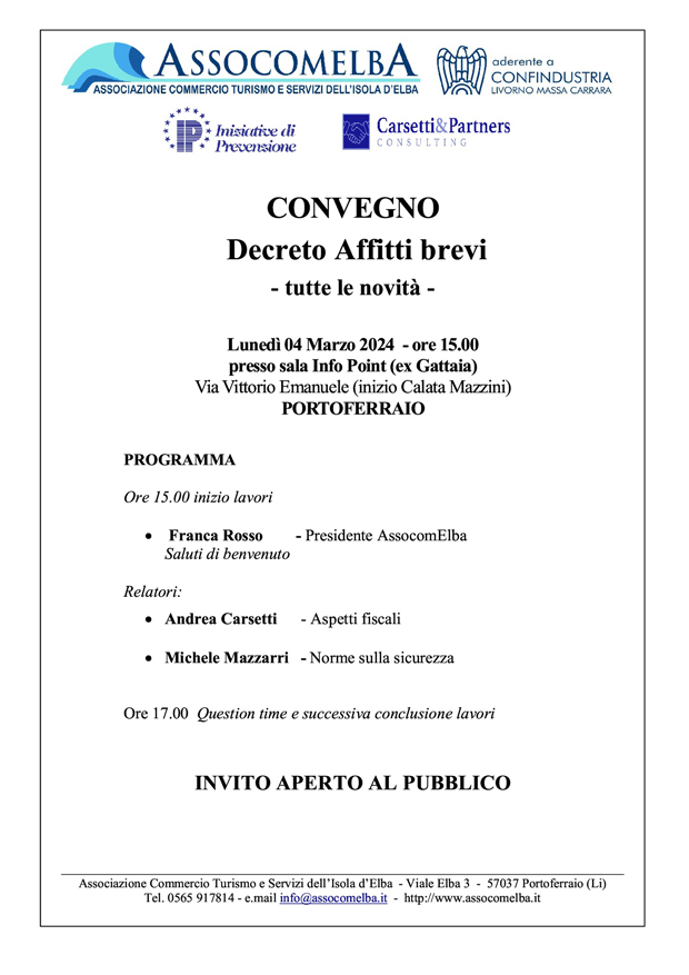 Per conoscere meglio il nuovo quadro normativo, AssoComElba aderente a Confindustria LiMs organizza un Convegno che si terrà Lunedì 4 marzo alle ore 15.00 presso la sala dell’Info Point (ex Gattaia) a Portoferraio.