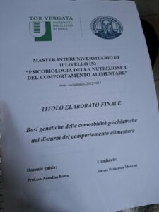 “Basi genetiche delle comorbidità psichiatriche nei disturbi del comportamento alimentare”: è questo l’argomento della tesi presentata dalla Dott.ssa Francesca Moncini al termine del Master Inter-Universitario di II Livello in Psicobiologia della nutrizione e del comportamento alimentare, organizzato congiuntamente dall’Università “Tor Vergata” e dall’Università Campus Bio-Medico di Roma.