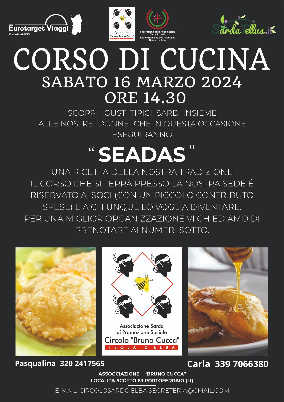 Sabato 16 marzo alle 14.30, si terrà un corso di cucina sarda organizzata dall’associazione Bruno Cucca. L’evento si svolgerà nella sede in località Scotto 83 a Portoferraio. Per l’occasione verranno eseguite le famose Seadas. Una ricetta molto apprezzata della tradizione sarda. Il corso è riservato ai soci e a chiunque voglia diventarlo. Per prenotare chiamare Pasqualina 320 2417565 o Carla 3397066380.