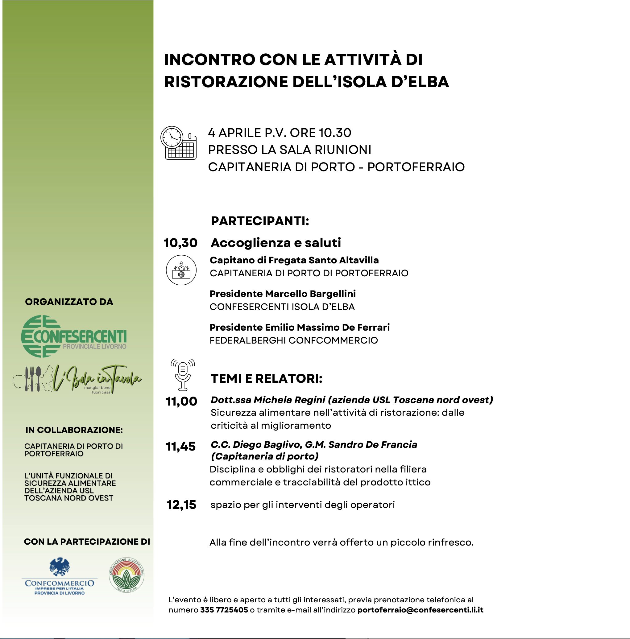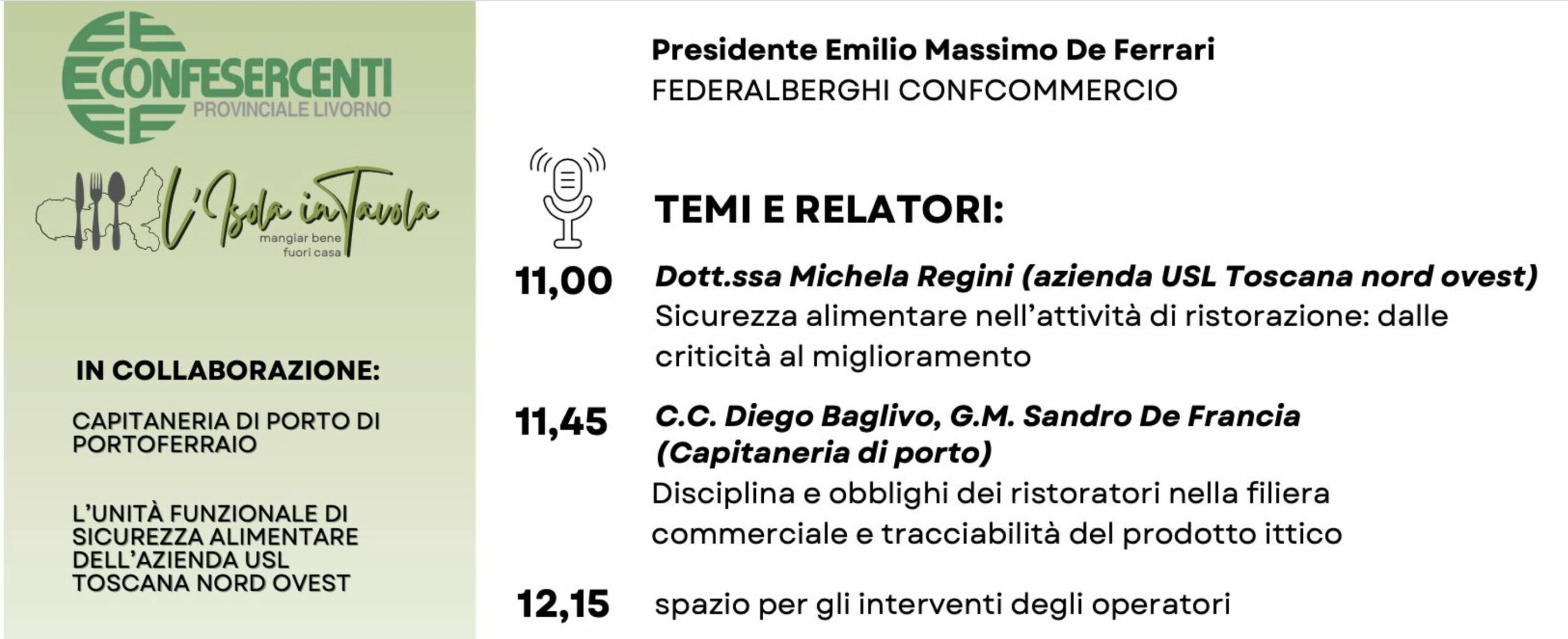 Giovedì 4 aprile, alle ore 10:30, si terrà presso la sala riunioni della Guardia costiera di Portoferraio un incontro organizzato da Confesercenti, in collaborazione con la Capitaneria di porto di Portoferraio e l’Unità Funzionale di sicurezza alimentare dell’Azienda USL Toscana nord ovest, e con la partecipazione di Federalberghi Confcommercio, rivolto alle attività di somministrazione di alimenti e bevande, per un approfondimento in materia di sicurezza igienico-sanitaria e di tracciabilità e corretta conservazione degli alimenti. Saranno evidenziate le maggiori criticità riscontrate dalle autorità durante le ispezioni e suggerite delle proposte di gestione in linea con le normative vigenti. Tale incontro, inoltre, sarà per gli operatori l’occasione per rivolgere quesiti od esporre le eventuali difficoltà di attuazione e di rispetto dei protocolli di sicurezza e per acquisire maggiore consapevolezza sulle modalità di svolgimento delle operazioni di controllo.