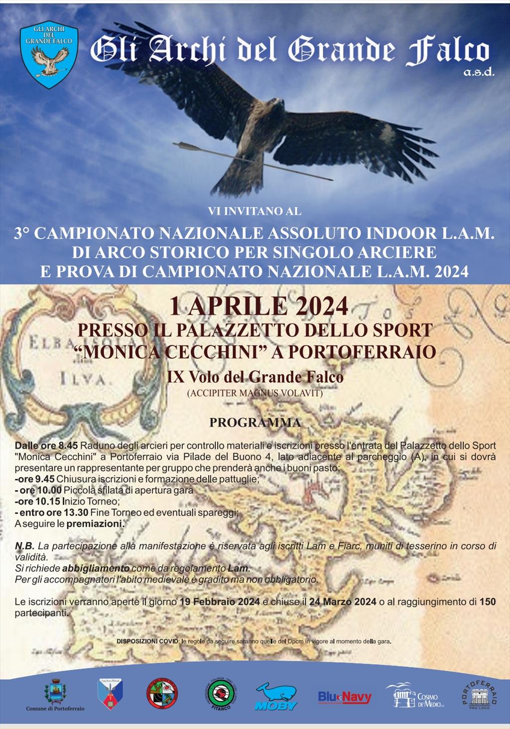 Anche quest’anno Gli Archi del Grande Falco hanno l’onore di organizzare il Campionato Nazionale Indoor di arco storico, prima gara del calendario della Lega arcieri Medievali 2024 e come di consueto il Palazzetto “Monica Cecchini” si vestira’ medievale.