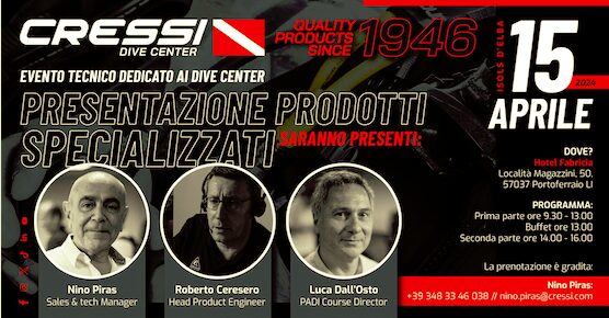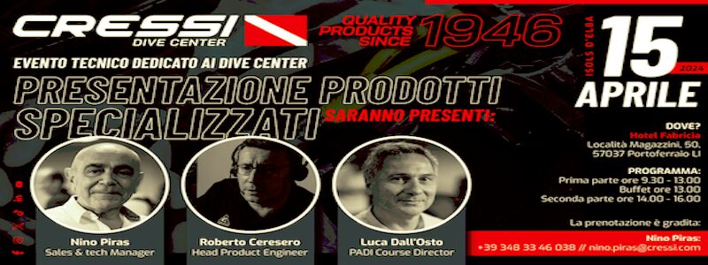 Il programma prevede : Una prima parte dalle 9.30 alle 13.00, poi un buffet e la seconda parte dell’evento, dalle 14.00 alle 16.00. Presenzieranno l’incontro, Nino Piras Sales&tech Manager , Roberto Ceresero Head Product Engineer e Luca Dall’Osto PADI Course Director. E’ gradita la prenotazione.