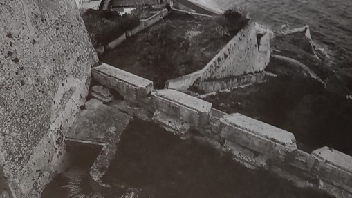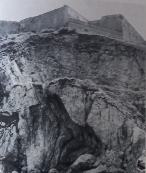 (Portoferraio .Scogliera tra la spiaggia delle Ghiaie e quella delle Viste.Sopra è la muraglia del bastione di S Ferdinando con troniere e parapetti .Tale muraglia poggia a destra sul fianco destro del bastione della Carciofaia o dell’Imperatore e a sinistra sul fianco del fronte di Sorbelloni )