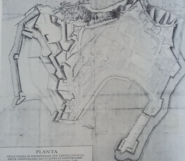 (Portoferraio 1758 .“Pianta della Piazza di Porto-ferrajo per l’intelligenza delle osservazioni fatte sopra le Fortificazioni della medesima li XIX Maggio M.DCC.LVIII” Disegno a china acquerellato su carta)