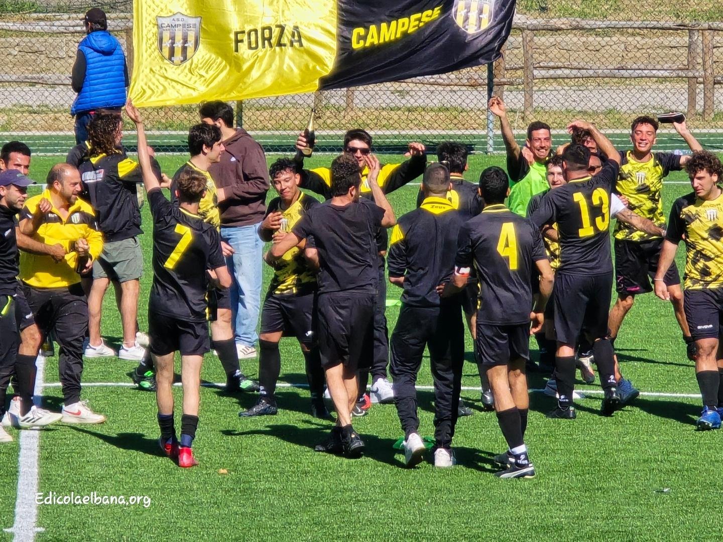Un campionato giocato e dominato in lungo e largo. La Asd Campese con ben 3 partite di anticipo ha vinto matematicamente il campionato girone Livorno di terza categoria. E’ bastata una vittoria , mercoledì 17 aprile presso il centro sportivo “Teseo Tesei” di Campo nell’Elba ,nella gara di recupero della 22° giornata contro il Romaiano ; un match vinto tranquillamente per due reti a zero, segnate dal bomber Davide De Luca che ha così aperto i festeggiamenti del popolo campese e non solo. Un risultato calcistico che fà onore a tutta l’isola, che la prossima stagione avrà un’altra squadra in seconda categoria. Da ricordare che lo scorso 31 gennaio, la società campese ha conquistato la Coppa Toscana di terza categoria girone Livorno battendo 2-1 in finale il Collesalvetti, un trofeo che mancava da 28 anni a Marina di Campo. La squadra giallonera detiene il miglior attacco a quota 67 gol e la miglior difesa della competizione con solamente 18 reti subite. I complimenti per questa straordinaria annata, sono rivolti al mister Gianni Gassinelli, ex giocatore e capitano del team isolano, che è riuscito a costruire un gruppo forte e coeso.