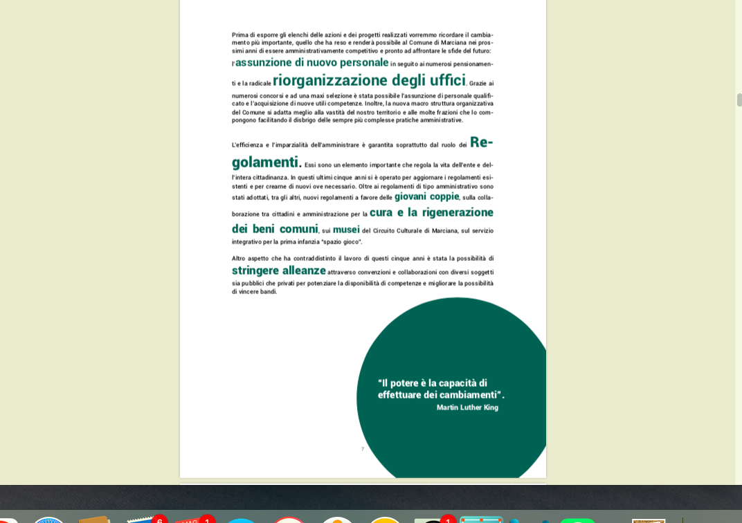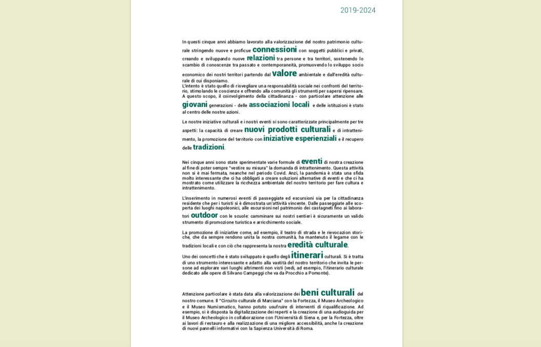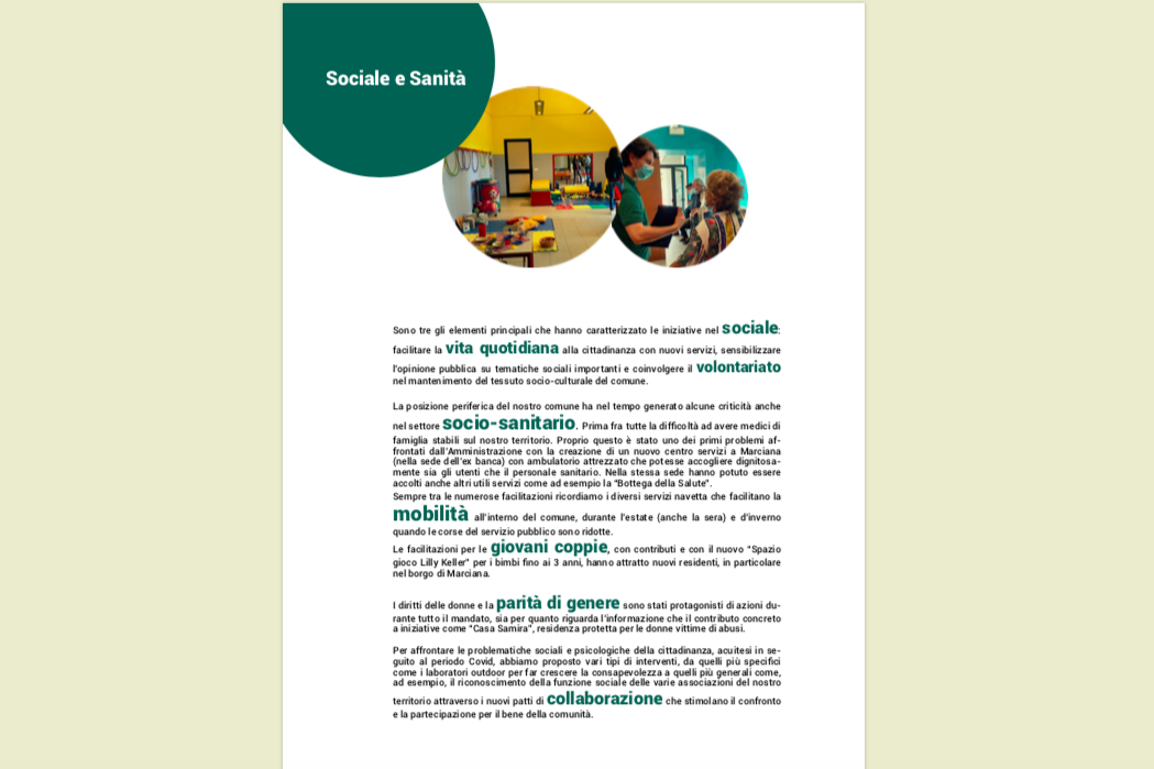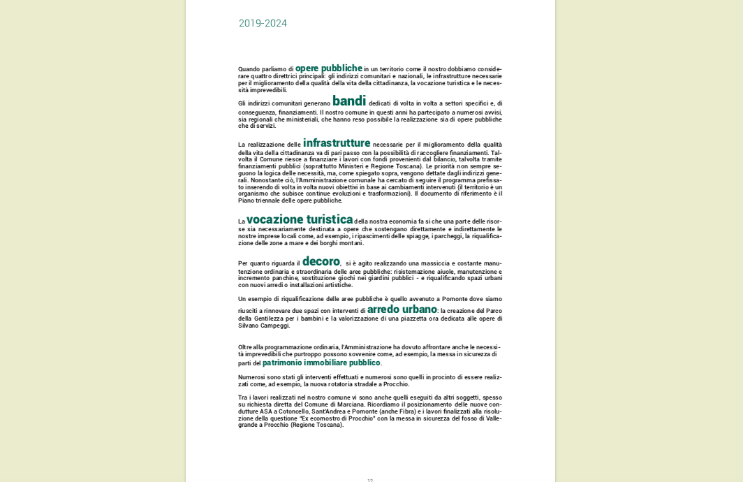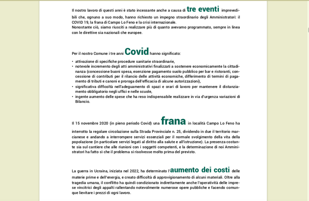 Comincia con queste parole il lungo resoconto delle azioni svolte dall’Amministrazione marcianese guidata dal Sindaco Simone Barbi nel quinquennio 2019-2024.