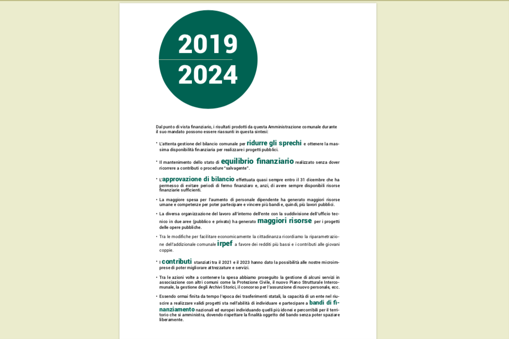 Ciò ha significato, per esempio, una facilità nell’instaurare relazioni proficue con gli altri enti e un’attenta gestione del bilancio comunale per ridurre gli sprechi e ottenere la massima disponibilità finanziaria per realizzare i progetti pubblici.