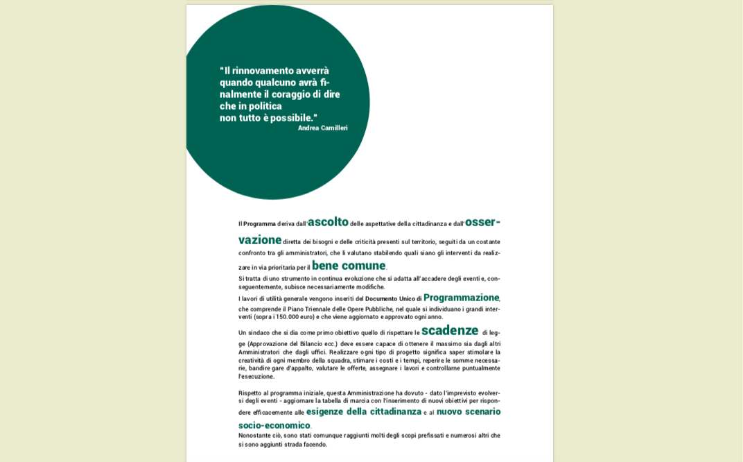 Sono trascorsi cinque anni e il nostro mandato è giunto al termine. E’ il momento di fare il punto sul nostro operato e sugli obiettivi che siamo riusciti a realizzare.