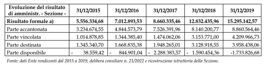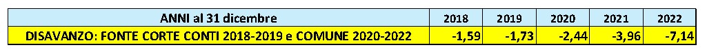 Adesso, prendiamo i dati del 2018 e del 2019 della Corte dei conti, gli anni a noi più vicini, e i dati ufficiali del Comune dal 2020 al 2022. Li riproduciamo in una successiva serie di cifre arrotondate al milione di euro con due decimali. Ciò per rendere più agevole la lettura degli importi. Il 2018 e il 2019 corrispondono esattamente alla Tabella della Corte dei conti. Ovviamente. I dati dal 2020 al 2022 corrispondono esattamente alle Deliberazioni del Consiglio comunale. Per ora non discutiamo i dati del Comune. Vedremo in futuro.