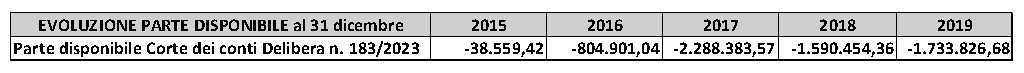 Concentriamo l’attenzione sull’ultima riga della Corte dei conti. Si tratta del disavanzo, cioè la parte disponibile negativa. Come definita dalla Legge. Presenta tutti segni meno, purtroppo. Il deficit alla fine di ciascun anno va dal 2015 al 2019. E il 2019 chiude in negativo con (-) 1,734 milioni di euro. Ora, per semplicità, prendiamo l’ultima riga della Corte dei conti e la riproduciamo sotto nella stringa numerica. Stessi importi. Ripetere giova.