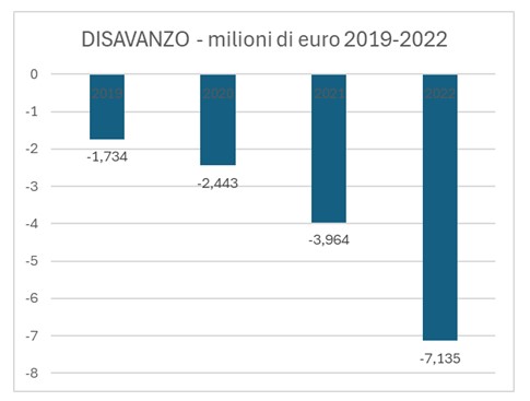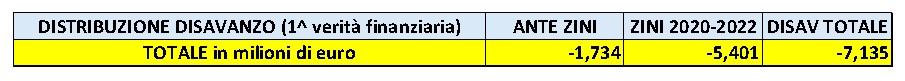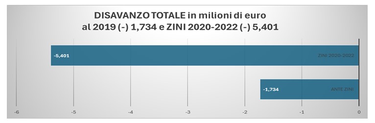 Quindi, per concludere la dimostrazione in atti, non resta che sottrarre ai (-) 7,135 milioni del 2022 i (-) 1,734 mln di euro maturati nel 2019. Ed ecco documentato, con una banale sottrazione, che il disavanzo di Angelo Zini ammonta a (-) 5,401 milioni. Segue sotto una piccola Tabellina con i tre dati appena comprovati.