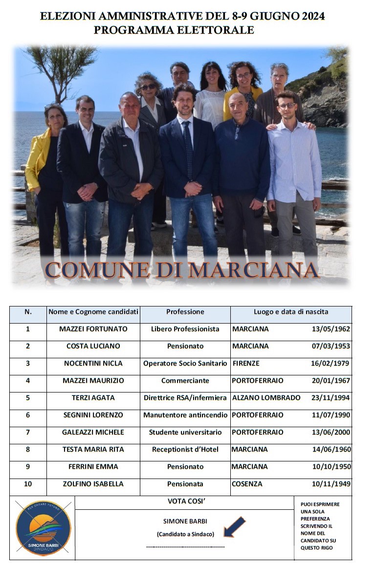 Ecco la lista “Per creare futuro, Simone Barbi sindaco” che si candida a Marciana per il secondo mandato. Insieme a Barbi sono in lista cinque uomini e cinque donne: Fortunato Mazzei ( libero professionista), Luciano Costa (pensionato), Nicla Nocentini ( operatore sociosanitario), Maurizio Mazzei ( commerciante), Agata Terzi ( direttrice rsa/infermiera), Lorenzo Segnini ( manutentore antincendio), Michele Galeazzi ( studente universitario), Maria Rita Testa ( receptionist d’hotel) , Emma Ferrini (pensianata) Isabella Zolfino ( pensionata) .