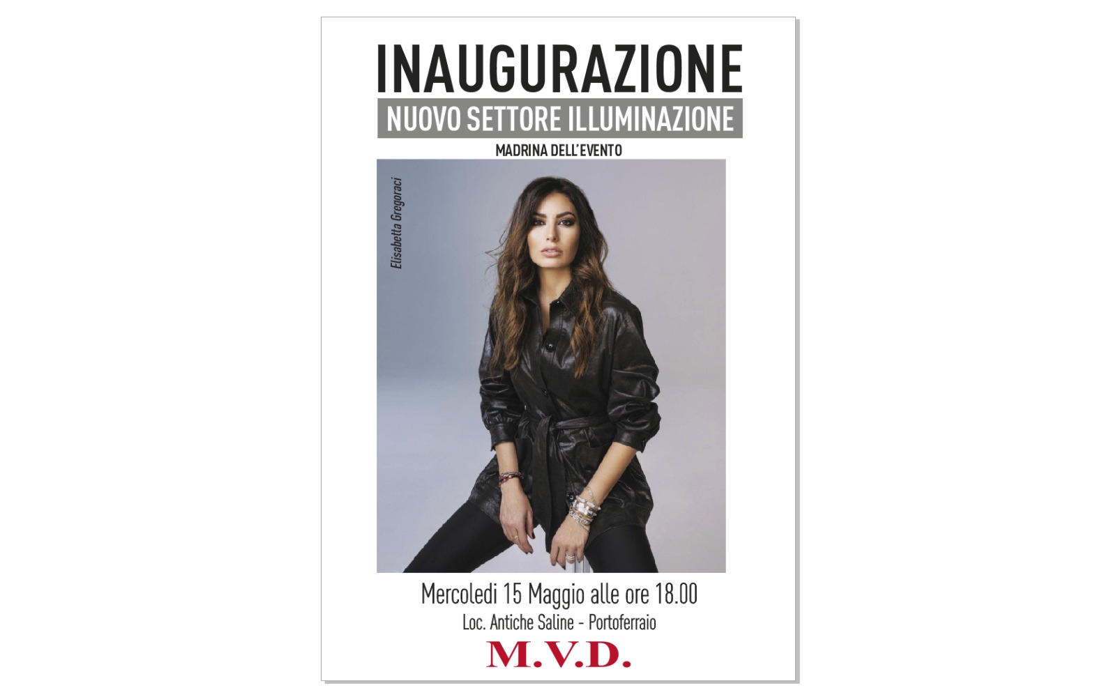 Sarà l’attrice e conduttrice televisiva Elisabetta Gregoraci a tagliare il nastro per l’inaugurazione del reparto illuminazione nello show room di MVD in località Antiche Saline di Portoferraio. L’evento si terrà mercoledi 15 maggio alle ore 18.00. Con il settore illuminazione chiude l’ultima fatica della MVD . Un settore importante per rendere la propria casa piena di vita e bella luce.