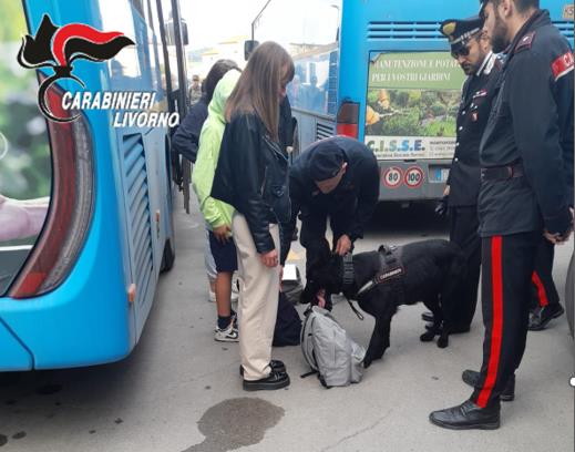Il lavoro di Titan cane antidroga condotto dall’unità cinofila del Nucleo Carabinieri San Rossore che ha partecipato alle operazioni, è stato determinante per il rinvenimento di sostanza stupefacente. Durante il controllo a bordo di uno dei mezzi addosso a un giovane studente sono stati rinvenuti grammi 9.70 di “hashish” verosimilmente pronti per essere utilizzati all’interno della scuola. Lo studente è stato segnalato alla Prefettura di Livorno quale assuntore.