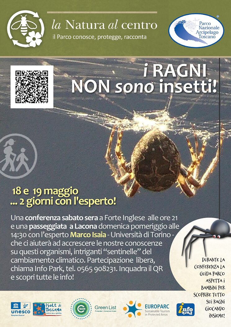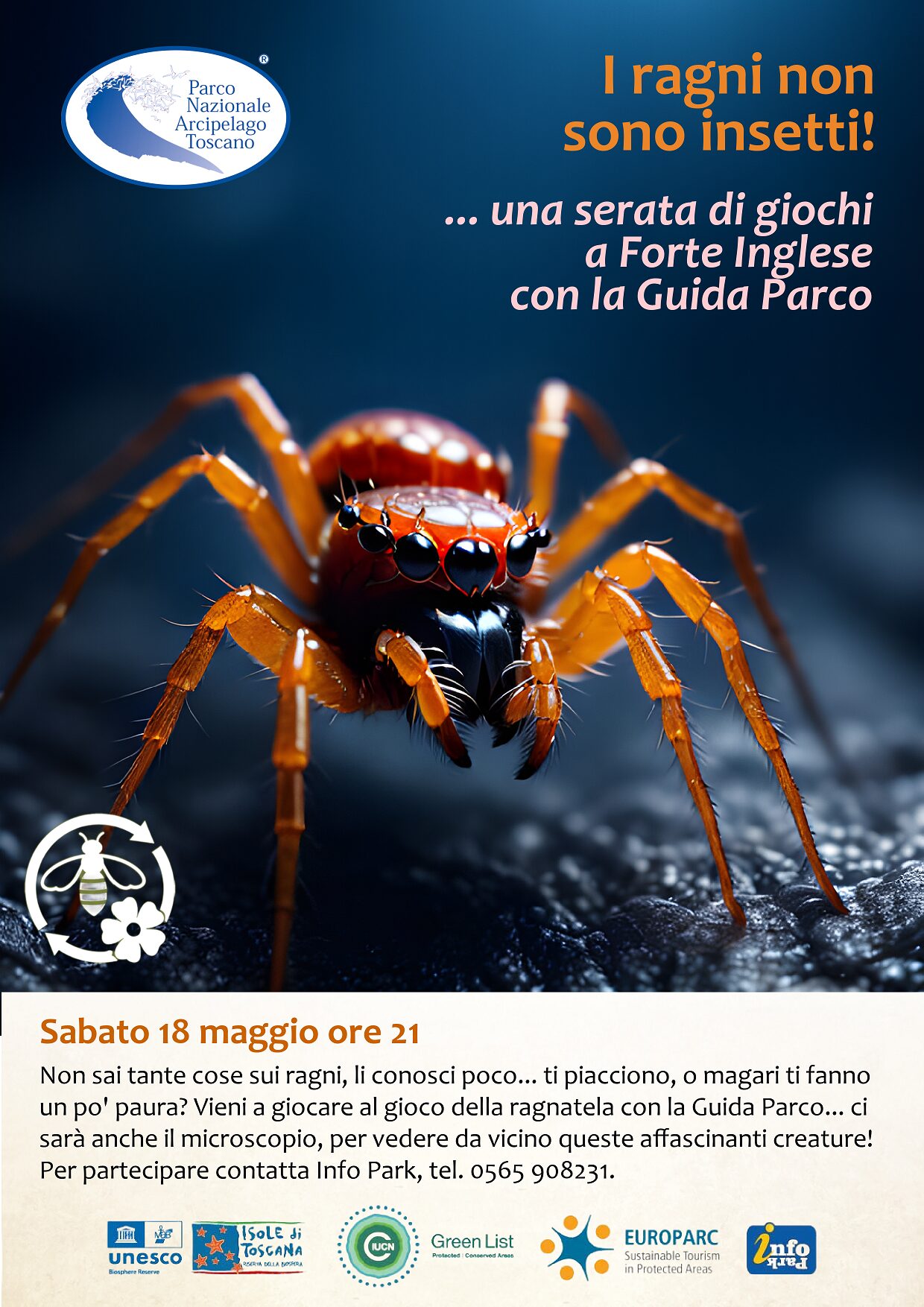 I ragni non sono insetti! – Una serata con l’esperto Marco Isaia – Dipartimento di Scienze della Vita e Biologia dei Sistemi, Università di Torino – che ci aiuterà ad accrescere le nostre conoscenze su questi organismi, intriganti “sentinelle” del cambiamento climatico, e ci trasmetterà alcuni dati raccolti durante le ricerche effettuate per conto dell’Ente Parco sul nostro territorio, allo scopo di approfondire le conoscenze sulla fauna araneologica dell’Arcipelago Toscano.