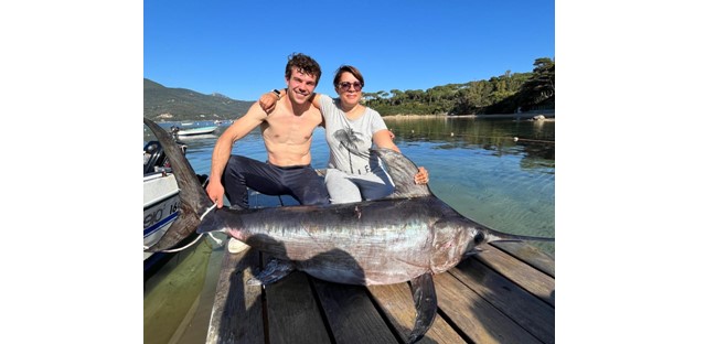 Giacomo Provenzali di Procchio con Giusy Passalacqua, durante una battuta di pesca a Drifting domenica 12/05 di fronte all’Enfola alle ore 7.15 hanno avuto la fortuna di allamare il loro pesce della vita. Dopo un’ora circa di combattimento sono riusciti ad avere ragione e tirare a bordo uno splendio pesce Spada di circa 100 kg un impresa non da poco vista la piccola imbarcazione di poco più di 5 mt.