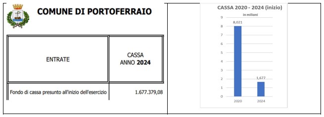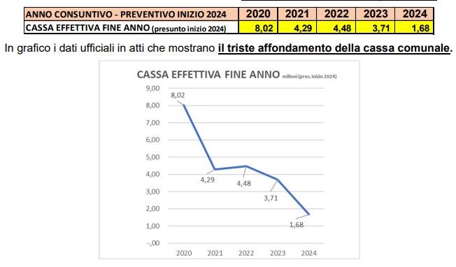 Ancora, con nostra Tabella e dati ufficiali, in 3 anni la diminuzione via via della cassa comunale dalla fine del 2020 all’inizio del 2024. Come si vede la cassa è sprofondata.