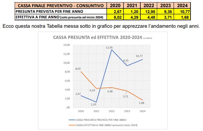 Ora un tema in più. Assai rilevante per cogliere un ulteriore aspetto. La Tabella sotto, predisposta sempre con dati ufficiali del Comune, ci dà anno per anno lo scostamento tra cassa presunta stimata ad inizio anno e cassa effettiva a fine anno. Si osservi la prima riga con i dati presunti a preventivo che nel 2022-2024 segnano cifre spropositate.