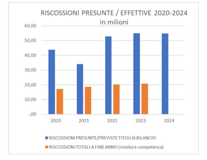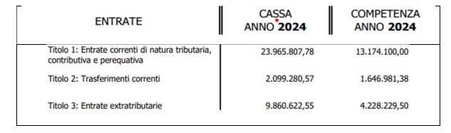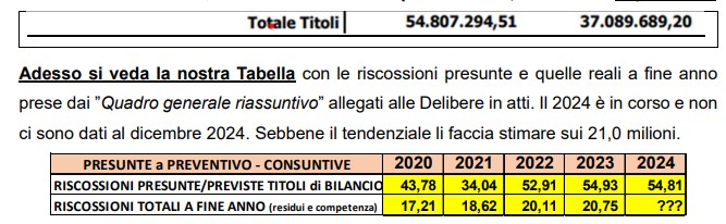 A riprova, come da foto che segue scattata ai soliti documenti comunali, nel 2024 la cassa totale Entrate Titoli di 54,8 milioni va oltre la competenza di 17,717 milioni. Impossibile.