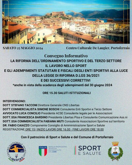 Un convegno sulla riforma dell’ordinamento sportivo, il lavoro nello sport e gli adempimenti statutari e fiscali degli enti sportivi alla luce della legge di riforma D.lgs 36/2021 e dei successivi correttivi. L’evento si terrà a Portoferraio, isola d’Elba, presso la sala De Laugier il giorno sabato 25 maggio 2024 dalle ore 15.00