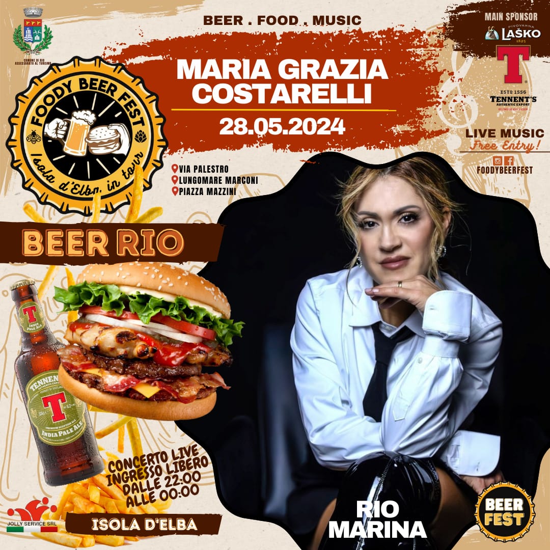 Martedì 28 Maggio a Rio Marina un nuovo appuntamento per per il FOODYBEERFEST. Dalle ore 18:00 con Djset by Ciccio Dj e a seguire dalle ore 22:00 alle 24:00 MARIA GRAZIA COSTARELLI LIVE