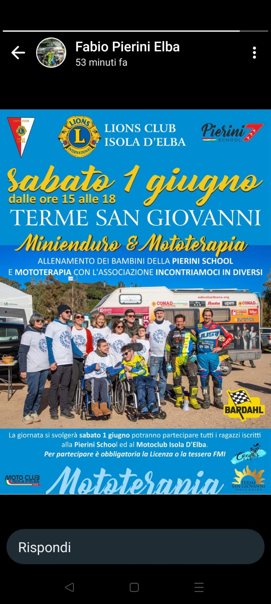 Sabato 1 giugno, dalle 15 alle 18 un pomeriggio con mini enduro e mototerapia alle Terme di San Giovanni. In collaborazione con il Lions Club isola d’Elba ci saranno allenamento dei bambini della Pierini School e mototerapia con l’Associazione Incontriamoci in Diversi e poi merenda per tutti. Potranno partecipare tutti i ragazzi iscritti alla scuola di Fabio Pierini e al Moto Club Iola D’Elba. Per partecipare è obbligatorai la Licenza o la Tessera Fmi.