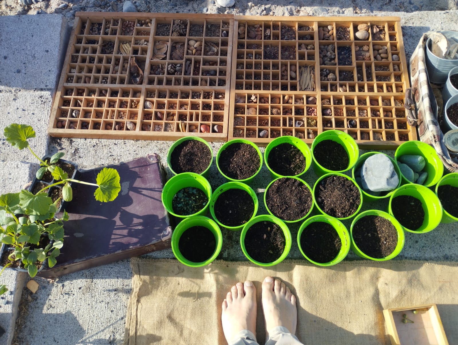 Ed è soprattutto nei più piccoli o in tutti coloro che sanno ascoltare il bambino che hanno dentro che l’esperienza creativa diventa un percorso artistico autentico che diventa quasi una performance collettiva. I partecipanti inizialmente prendono contatto con la terra, quella nera e fertile ricca di humus o quella magra, asciutta e sabbiosa passando per la rossa, la bianca, dei vulcani, delle montagne, delle campagne. Una volta scelta e/o miscelata ecco che si può scegliere fra decine di semi di ogni forma e colore pronti a “farsi un tuffo” proprio in quell’oro nero che li aspetta. La semina è da sempre un atto libero e magico, è l’apoteosi dell’incontro. Seppur silenzioso, a volte inaspettato e fuori controllo, la semina è la speranza di una foresta di perpetuare il suo mantello verde, è il quotidiano rituale dell’uomo saggio che ha fede nel domani. I bambini sono seminatori puri e generosi, inconsapevoli architetti del paesaggio selvaggio.