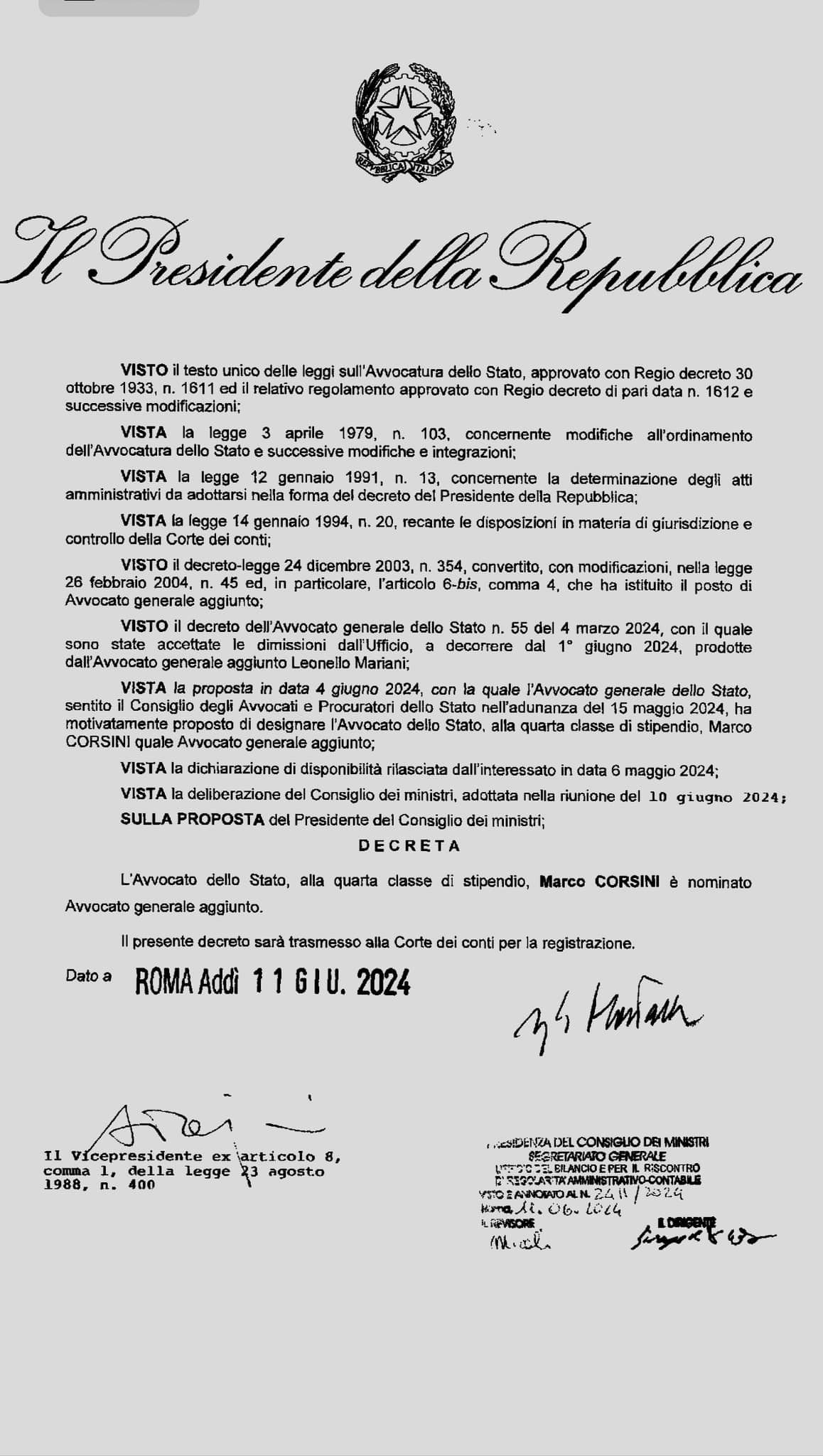 “Con decreto del Presidente della Repubblica 11 giugno 2024 – scrive Marco Corsini – sono stato nominato Avvocato Generale Aggiunto. È un traguardo importante di un percorso al servizio dell’Istituzione cui ho l’onore di appartenere, e che ho sempre amato tantissimo”.