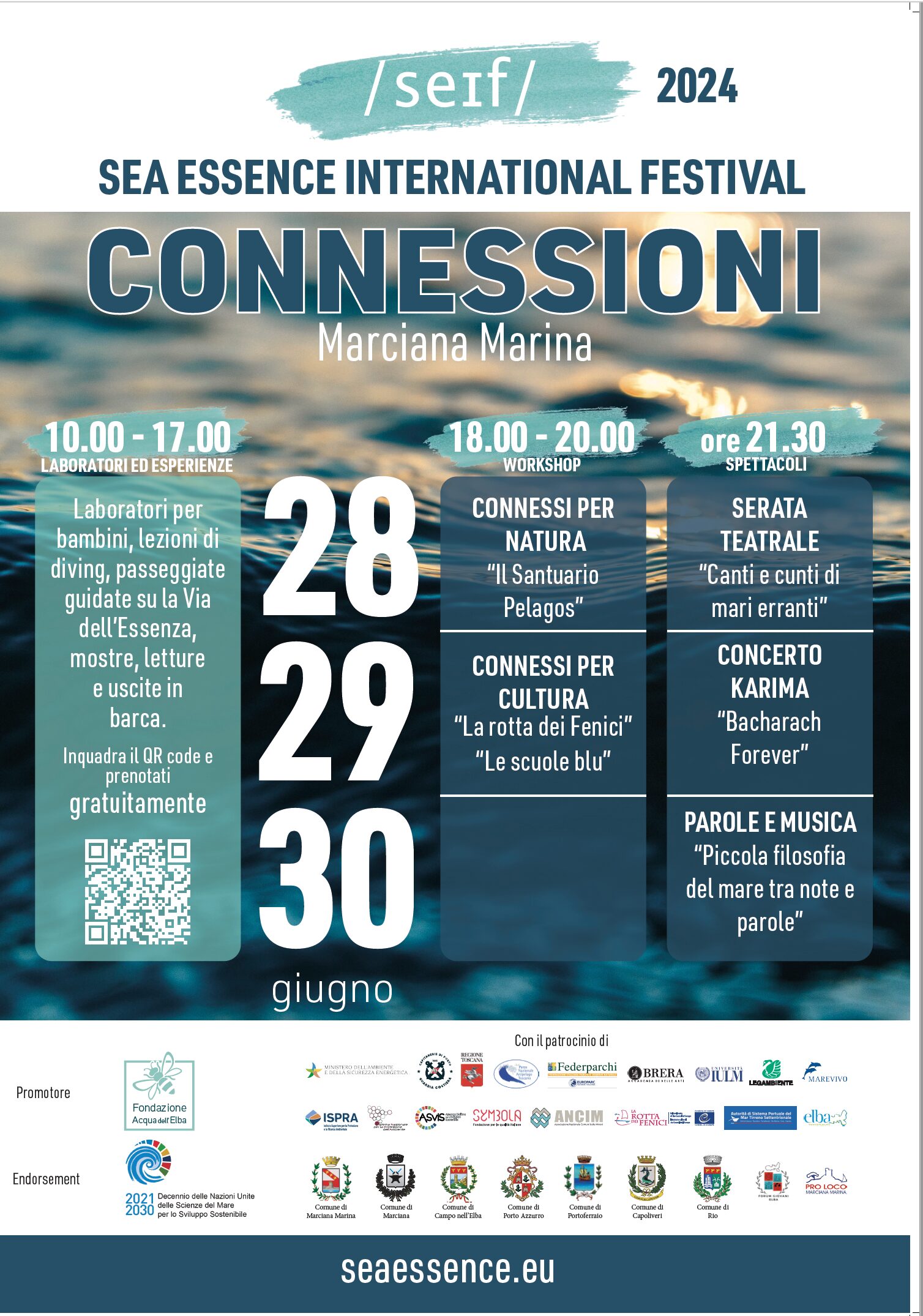 Massimo Canino, lezioni di diving gratuite, percorsi guidati sulla Via dell’Essenza, esperienze di nautica inclusiva in compagnia del velista italiano Marco Rossato e dei “Timonieri Sbandati”. Ogni sera, infine, spazio all’intrattenimento con spettacoli teatrali e concerti dal vivo. Fondazione Acqua dell’Elba presenta il programma della sesta edizione di SEIF – Sea Essence International Festival, il primo festival internazionale dedicato alla salvaguardia e valorizzazione del mare e della sua essenza. Il festival prevede numerose iniziative, tutte gratuite, e si svolgerà dal 28 al 30 giugno nella cornice di Marciana Marina, suggestivo borgo marinaro dell’Isola d’Elba e punto d’osservazione privilegiato per discutere delle importanti tematiche marine e ambientali. La manifestazione ha ricevuto l’endorsement del Decennio delle Scienze del Mare per lo Sviluppo Sostenibile delle Nazioni Unite (2021-2030) e il patrocinio – tra gli altri – del Ministero dell’Ambiente e della Sicurezza Energetica, di Guardia Costiera – Capitaneria di Porto e Regione Toscana. Fondazione Acqua dell’Elba ha costruito il programma di SEIF 2024 intorno al tema delle “Connessioni” (per Natura, per Cultura e per Amore) con l’obiettivo di celebrare la straordinarietà e l’importanza di tutte le relazioni economiche, ambientali, culturali e sociali che il mare ha nel tempo permesso di sviluppare. Saranno tre giorni di spettacoli, dibattiti, attività ludiche, volontariato ambientale ed esperienze per raccontare, con un approccio multidisciplinare, l’equilibrio tra sostenibilità ecologica, ambientale e sociale. Come ogni anno le tre giornate del festival sono divise in tre parti: le attività educative ed esperienziali della mattina e del pomeriggio; i seminari del preserata; gli spettacoli serali.