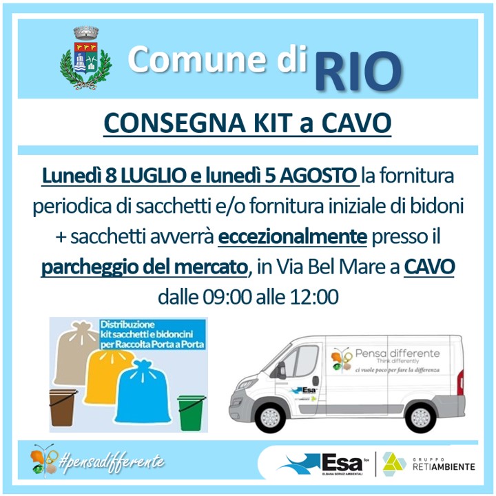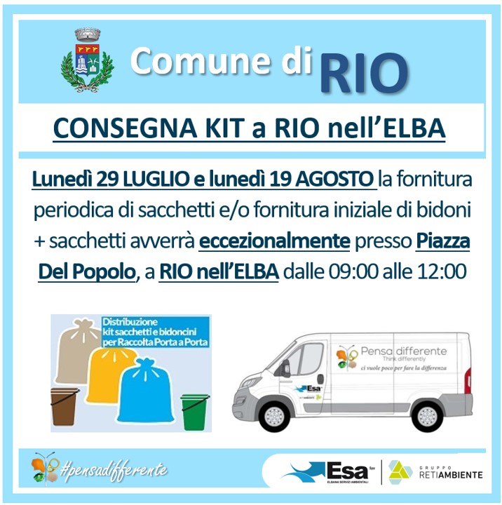 ESA comunica ai cittadini del Comune di Rio le modalità di distribuzione dei kit domestici nei mesi di luglio e agosto, secondo il seguente calendario: