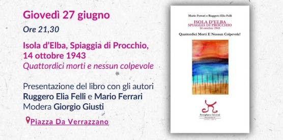Giovedì 27 giugno alle ore 21,30 in PiazzaDa Verrazzano a Marina di Campo ci sarò la presentazione del libro Isola d’Elba. Spiaggia di Procchio. 14 ottobre 1943. 14 morti e nessun colpevole. Persephone Edizioni.per Storie Itineranti 2024, con gli autori Ruggero Elia Felli e Mario Ferrari, modera Giorgio Giusti.